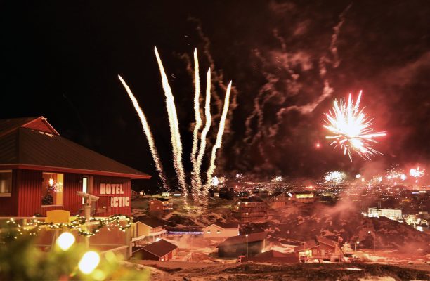 Nytårsaften er særligt speciel i Grønland, og nok især fordi vi fejrer den to gange: Klokken 21 for Danmark og klokken 24 for Grønland! De fleste af os har familie i Danmark, som vi tænker meget på, så det vil vi gerne vise ved at holde nytår med dem, når klokken slår 24 i Danmark. Derfor går vi klokken 21 ud og fyrer raketter af for dem og byder dem ind i det nye år. Så går vi ind og spiser mere og hygger og venter på, at vi også kan fejre vores eget nytår.