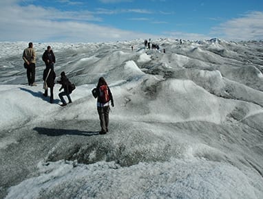 På afstand ser vi den imponerende Russell Gletsjer, der hæver sig op i landskabet. Vores endemål er Punkt 660, som ligger 660 meter over havets overflade. Her gør bussen et stop og vi går det sidste stykke op på selve Indlandsisen. Nu står du på den største gletsjer på den nordlige halvkugle.